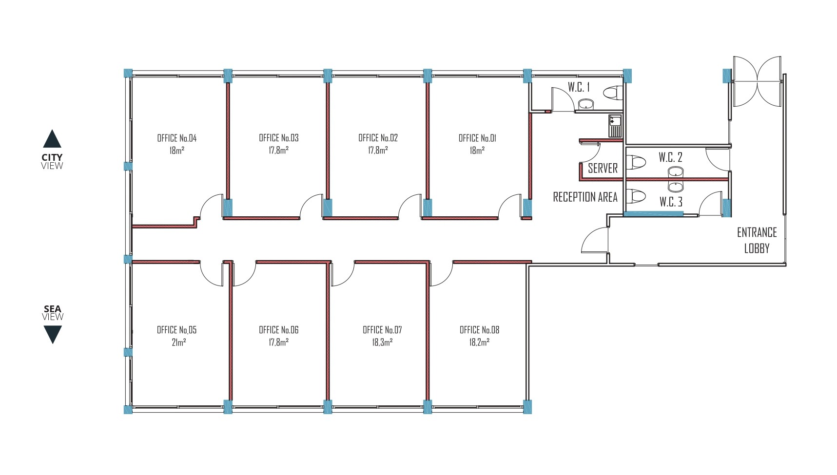 Offices 6, 7, 8: Internal area: 18 m² – Price: € 800 (each) per month.