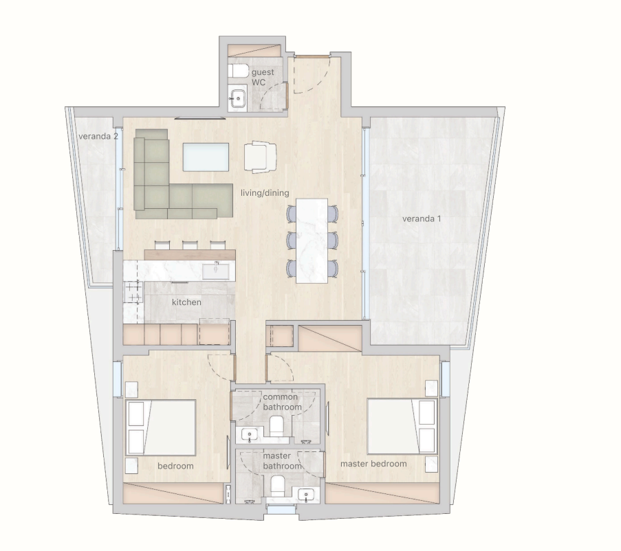 This unique project is located in the Katholiki area of Limassol, close to all amenities including shops, supermarkets, restaurants, and cafes. The complex offers a gated community with a children’s playground, communal swimming pool, landscaped gardens, outdoor sports facilities, gym, and sauna. The apartment features an open-plan living area, 2 bedrooms, 3 bathrooms, and a covered veranda.